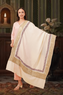 • Ivory Overall Jamawar Pure Pashmina Shawl with PaperMachie Embroidery Design