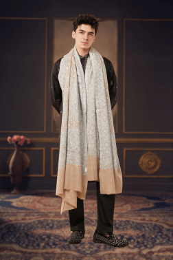 Grey & Beige Sozni Jama Embroidered Pure Pashmina Shawl with Silk Thread for Men