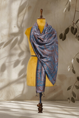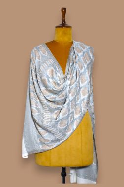 Grey-Blue Pure Silk Paisley Jamawar Stole
