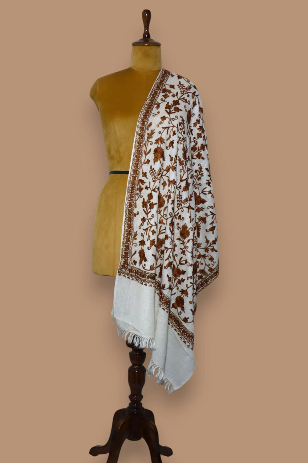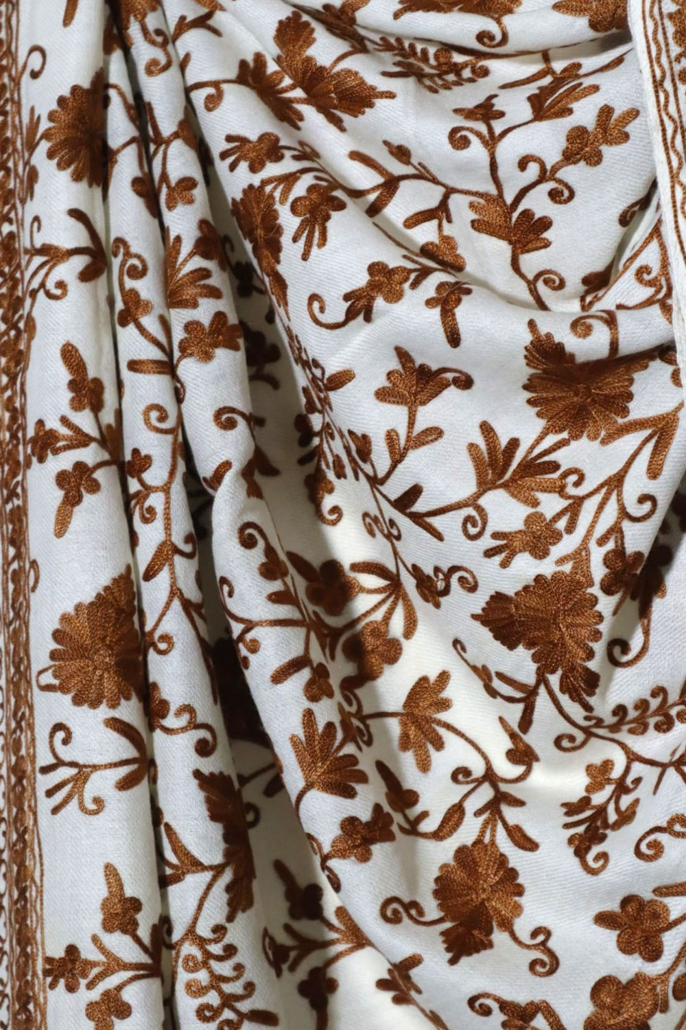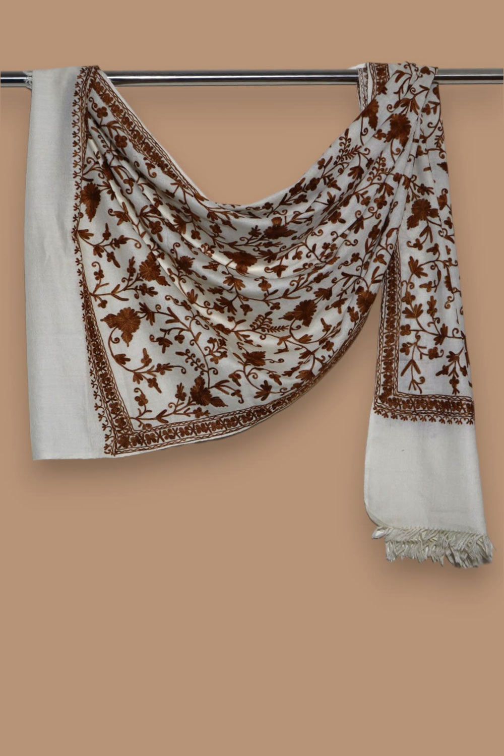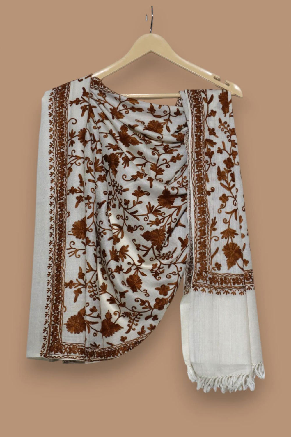 This elegant stole showcases the exquisite Ari jaal technique—fine chain-stitch embroidery entirely covering the rich ivory Pashmina base. The warm chestnut tones bring depth and elegance, while the continuous florals create a timeless, regal aesthetic. Soft, breathable, and sophisticated, this piece is perfect for formal events or as a luxurious gift.
