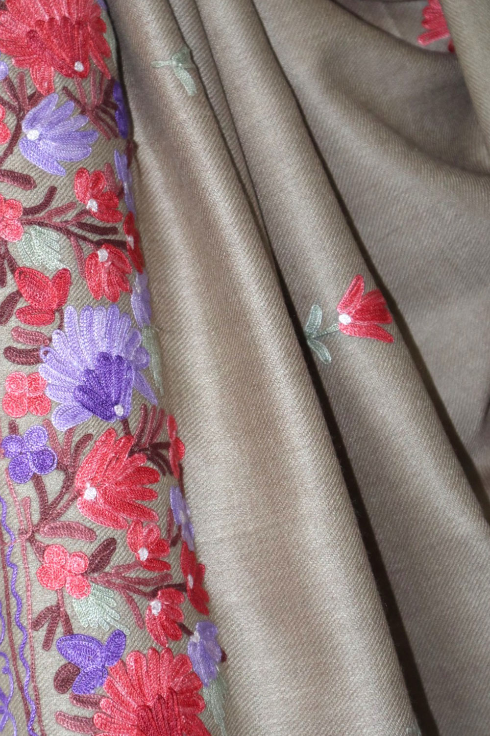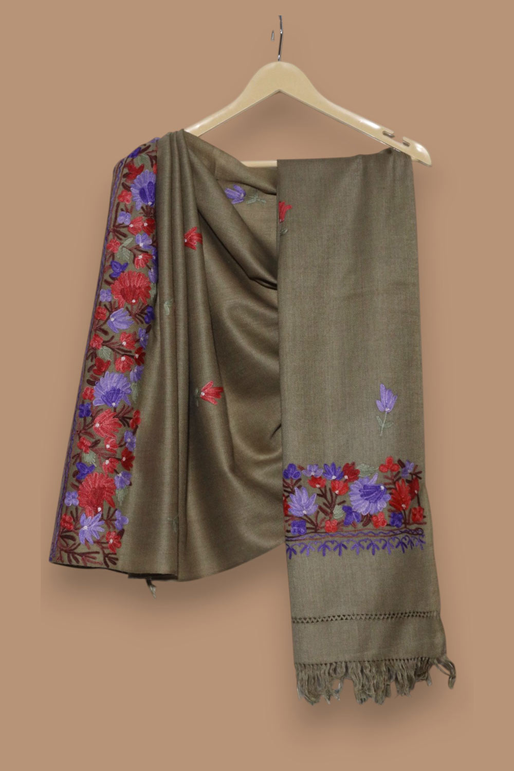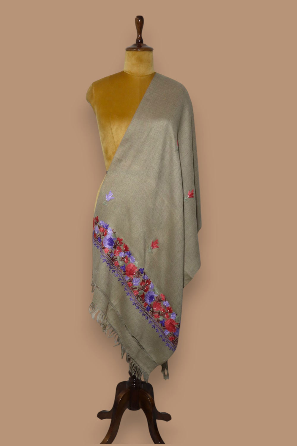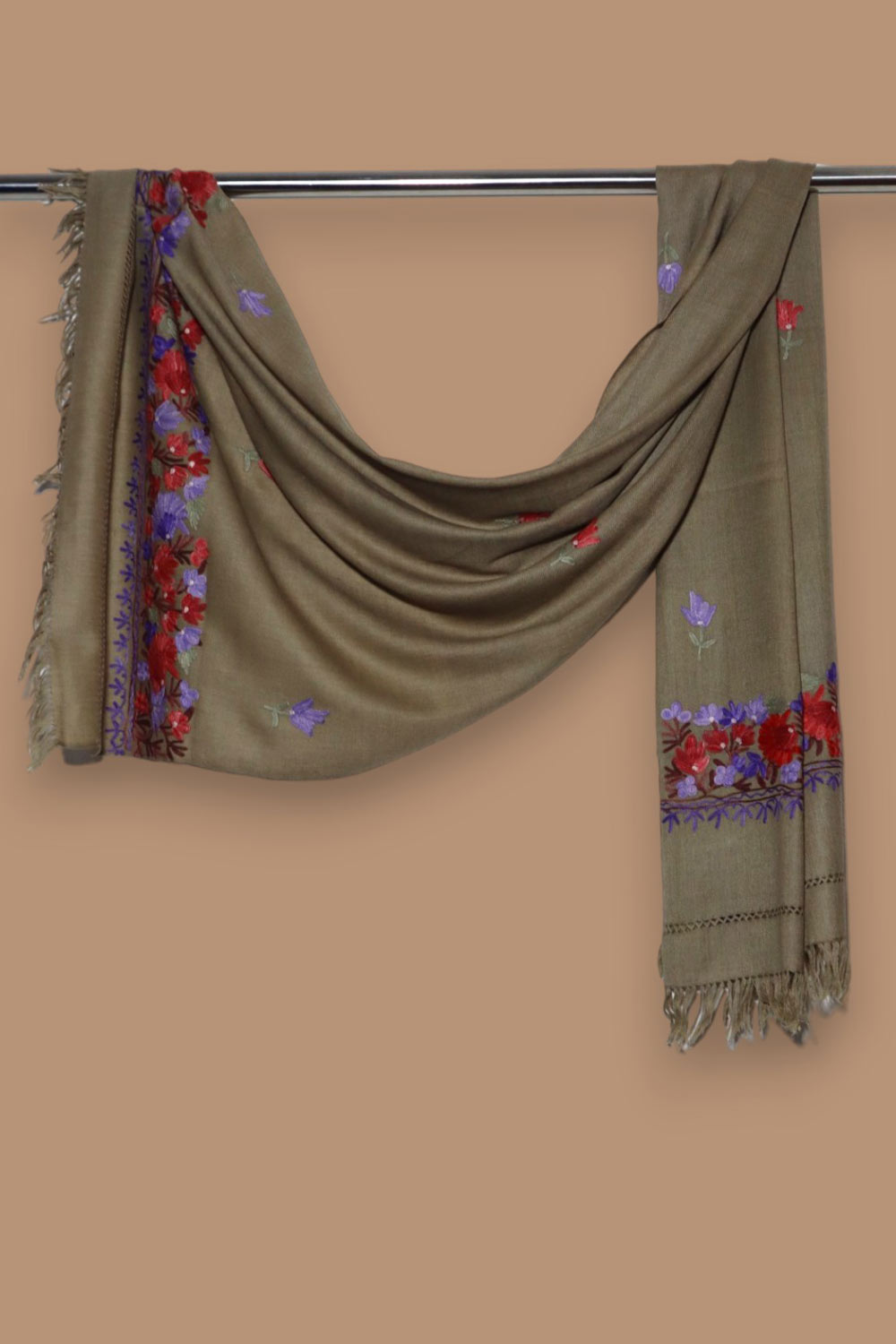Subtle yet striking, this stole features jewel-toned florals on an understated olive canvas. The design is bold at the palla ends but retains elegance through simplistic accents elsewhere. Lightweight and versatile, it layers beautifully with both formal coats and casual jackets.
