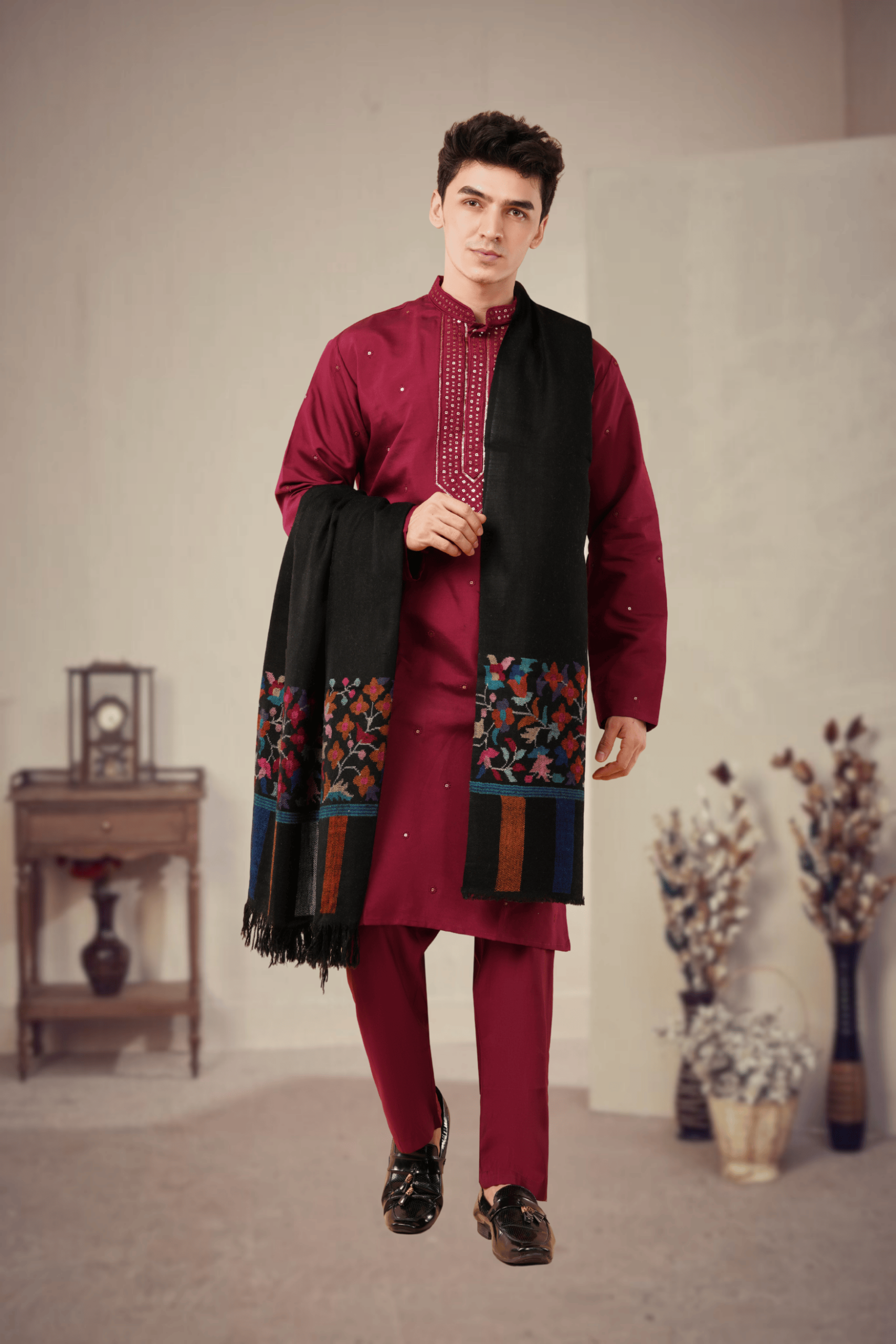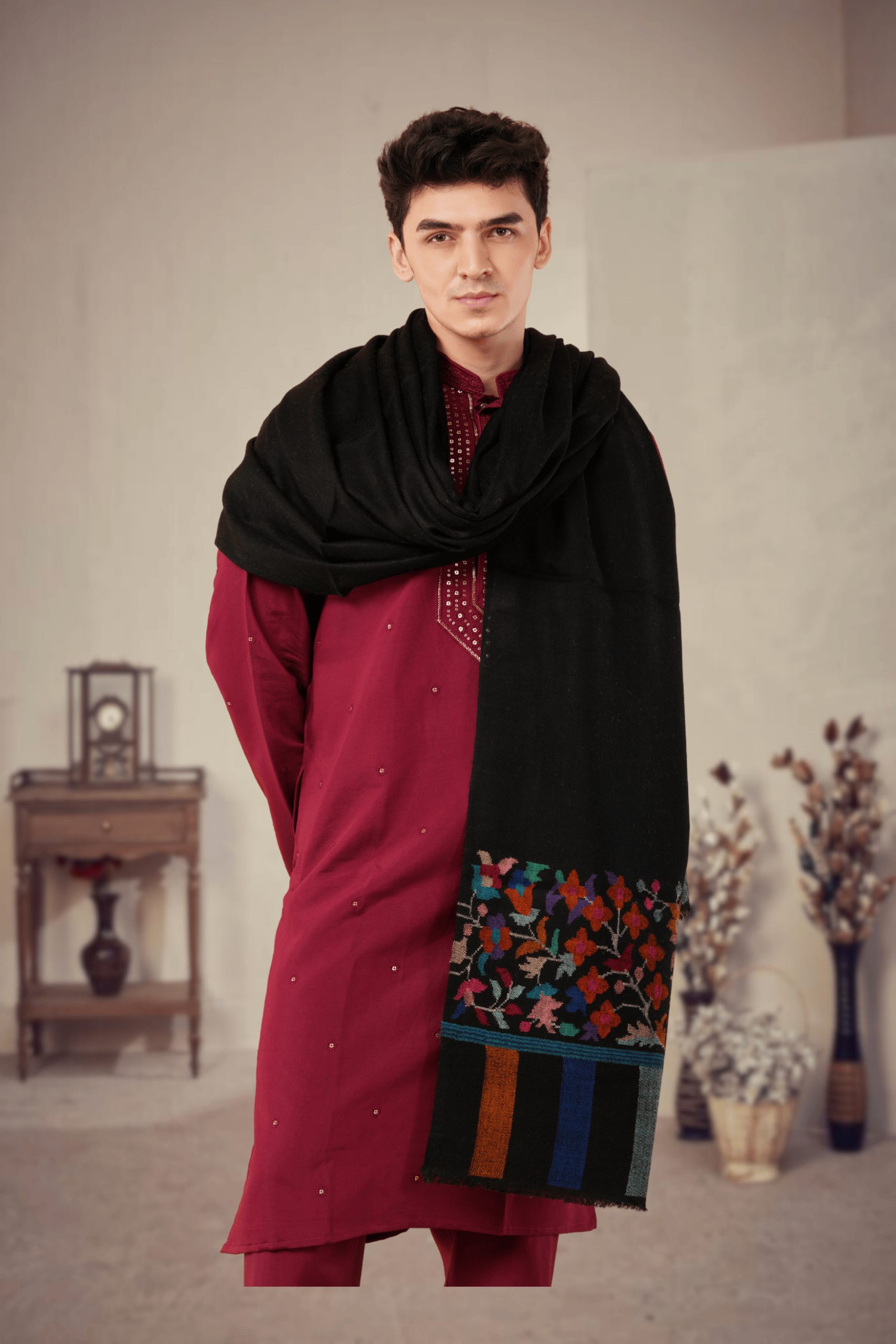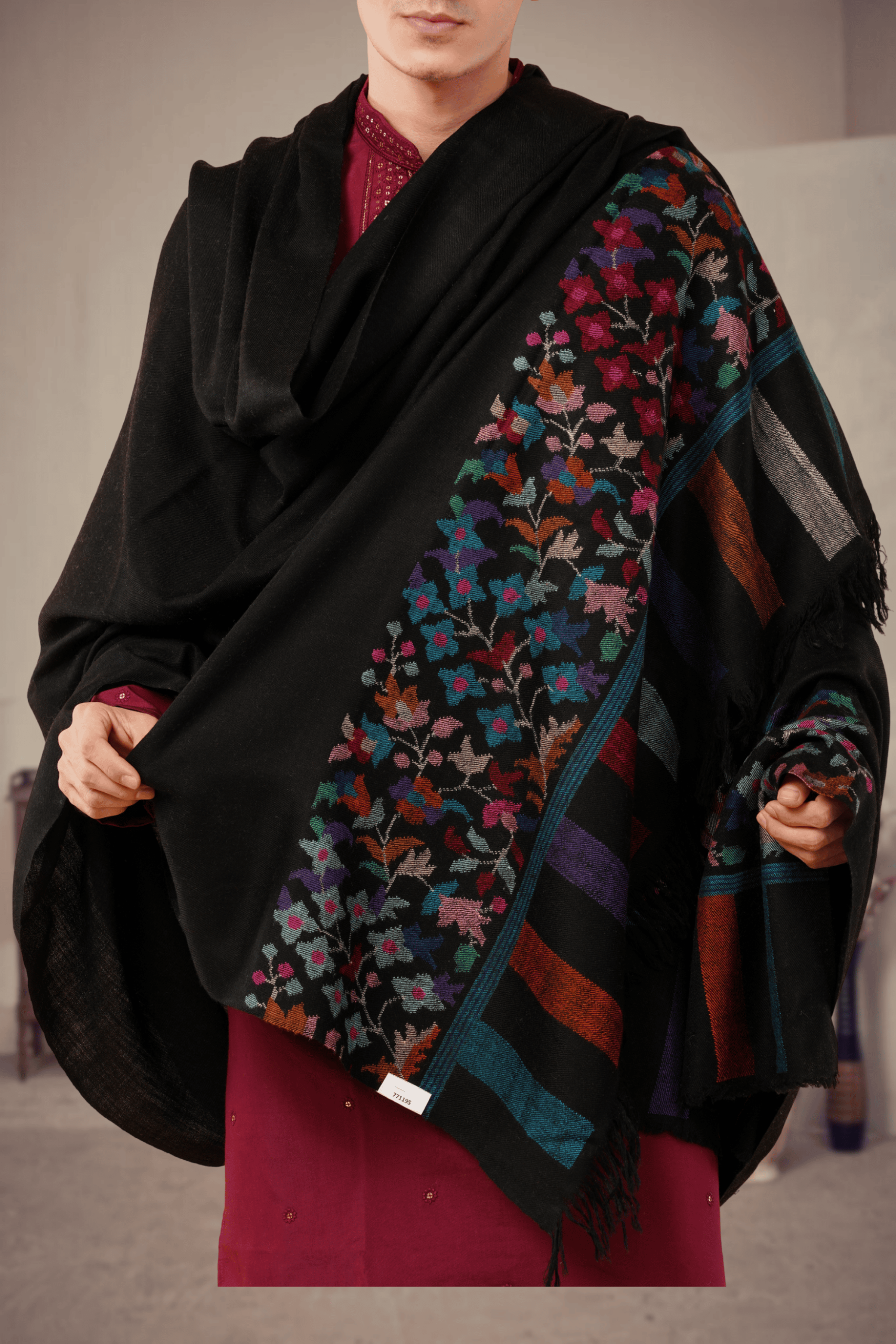 Description: Elevate your traditional wardrobe with this exquisite Black Kani Palladaar Pure Pashmina Shawl for men. Crafted from the finest Pashmina wool, this shawl offers unparalleled warmth and a luxurious drape. Its defining feature is the stunningly detailed hand embroidery on the pallu, creating a “palla daar” effect with vibrant floral that burst forth in a spectrum of colors. The deep black body provides a striking backdrop, making this a sophisticated and statement-making accessory perfect for formal occasions or adding a touch of grandeur to any ensemble.