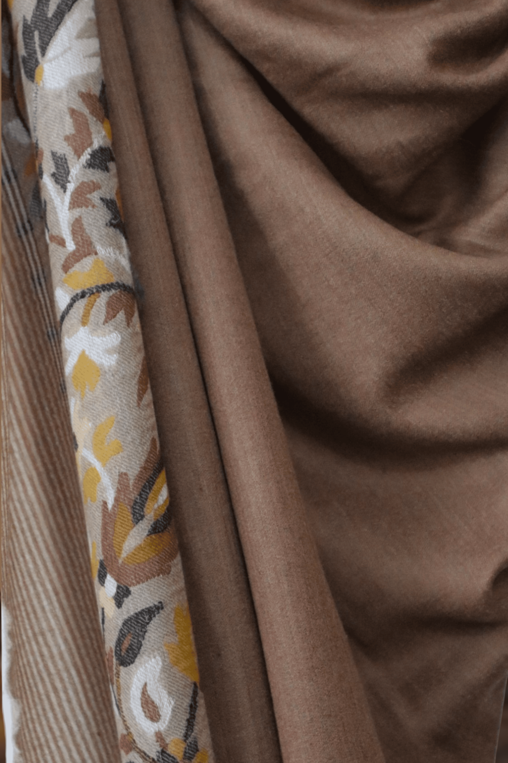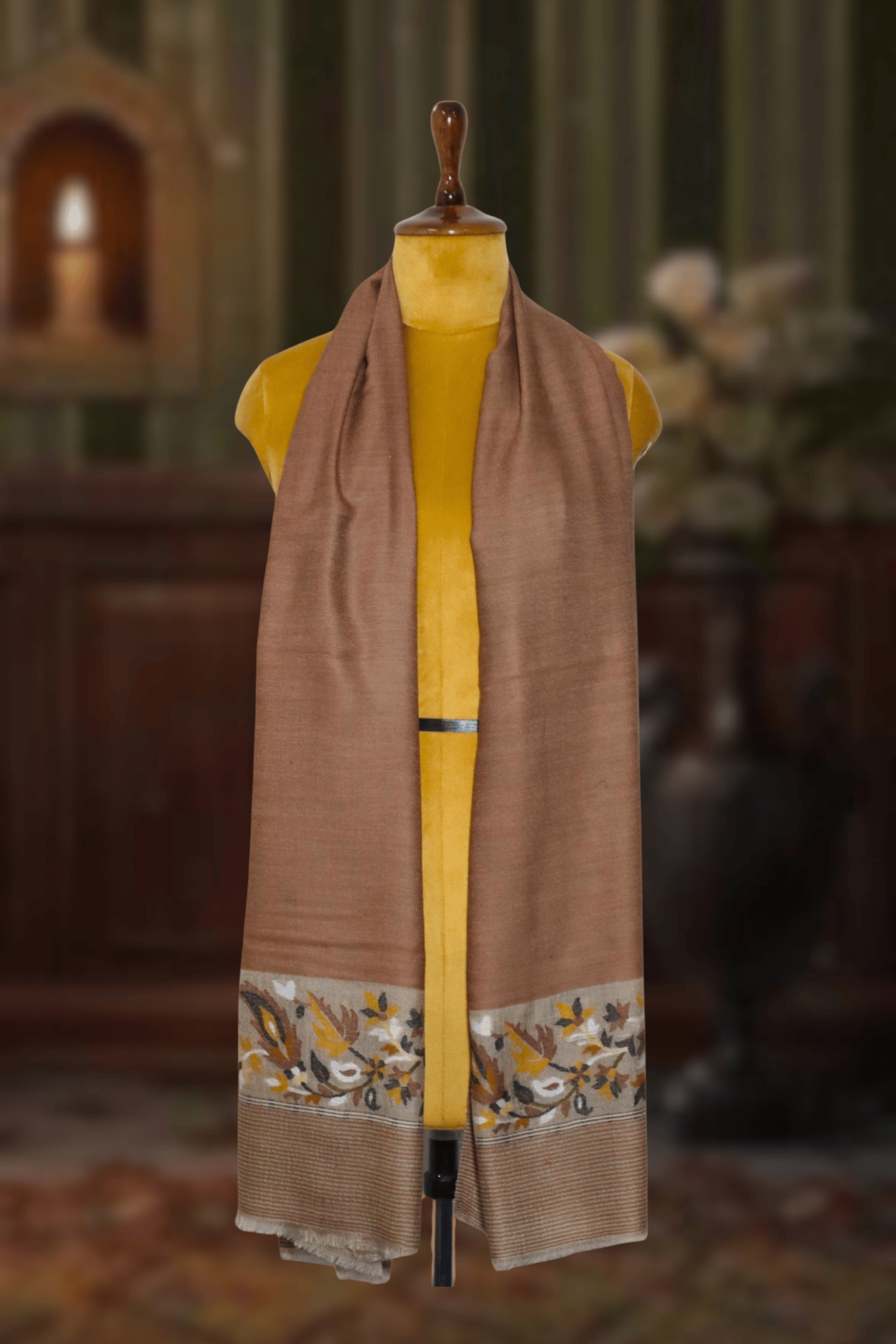 - Description: This elegant Brown Kani Palla Cashmera Fine Wool Stole is a testament to sophisticated Kashmiri weaving. Crafted from Cashmera fine wool, the main body features a soft, solid brown hue, offering a versatile and warm foundation. Its distinguishing feature is the exquisitely woven Kani palla (end panel) at one end, adorned with an intricate pattern of leaves and subtle floral motifs in muted tones of cream, light blue, and grey. This stole elegantly blends traditional artistry with a contemporary minimalist aesthetic, making it a perfect accessory for various occasions.