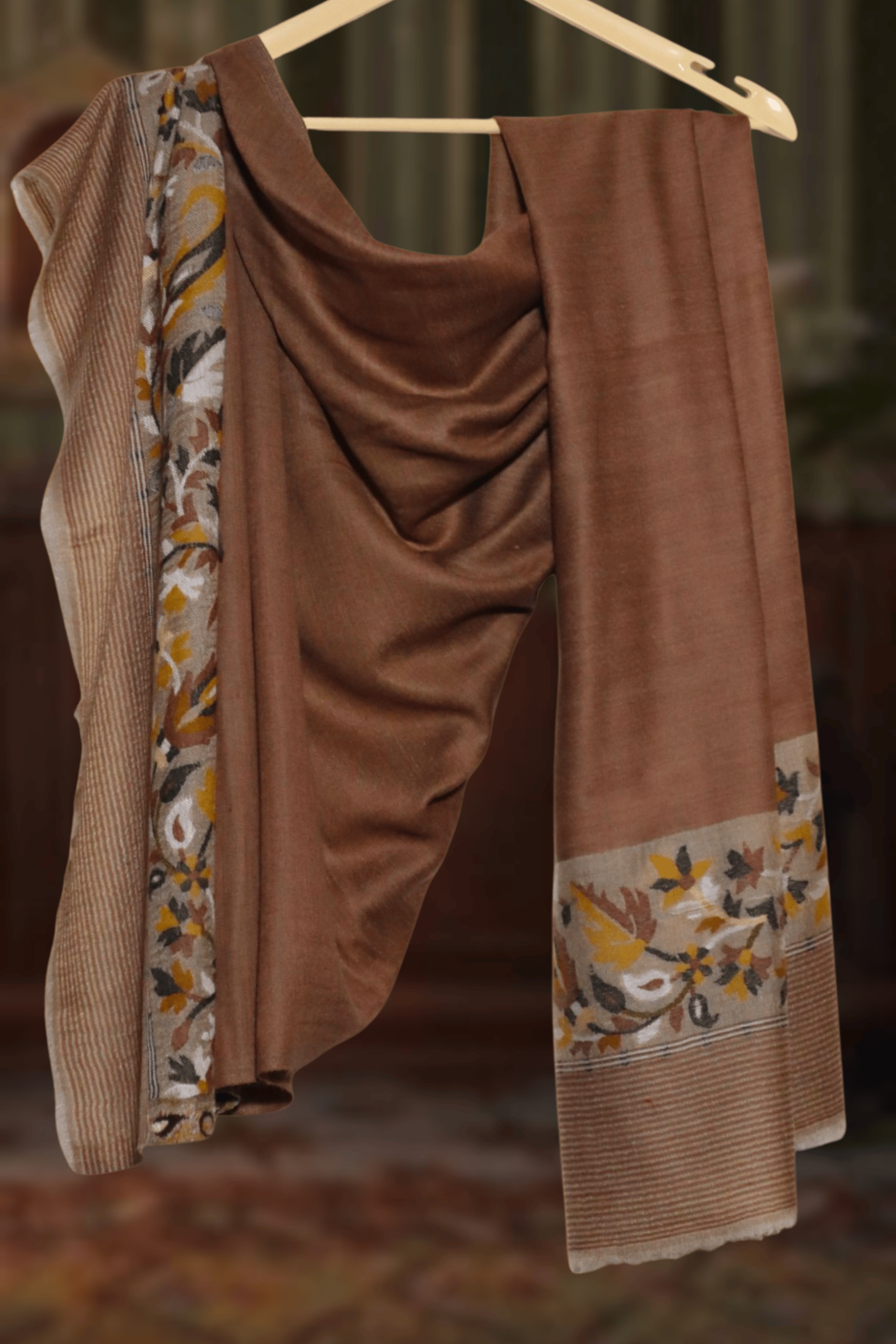 This elegant Brown Kani Palla Cashmera Fine Wool Stole is a testament to sophisticated Kashmiri weaving. Crafted from Cashmera fine wool, the main body features a soft, solid brown hue, offering a versatile and warm foundation.
