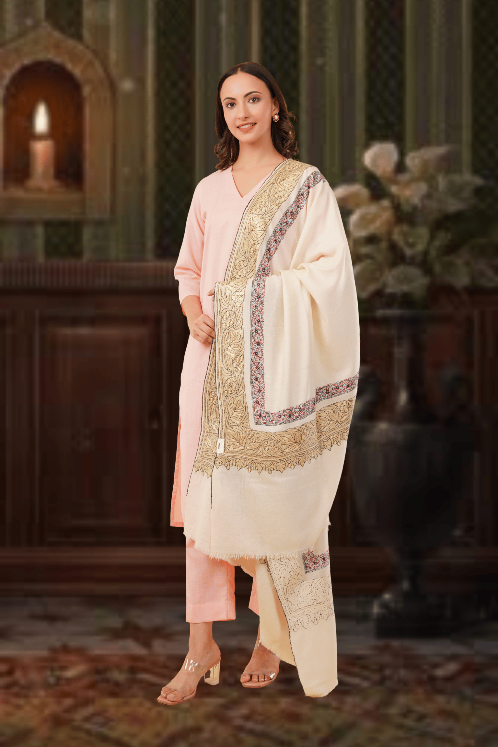 Combining subtle grace with ornate detail, this Pashmina shawl features hand-embroidered motifs in jewel-toned threads and is finished with a rich golden zari border. The refined tone sets the stage for elegance, making it a refined pick for evening wear or cultural gatherings. Luxuriously soft, this piece brings heritage and style together.