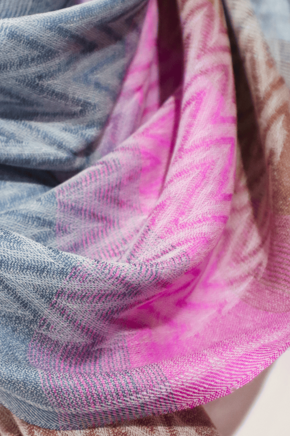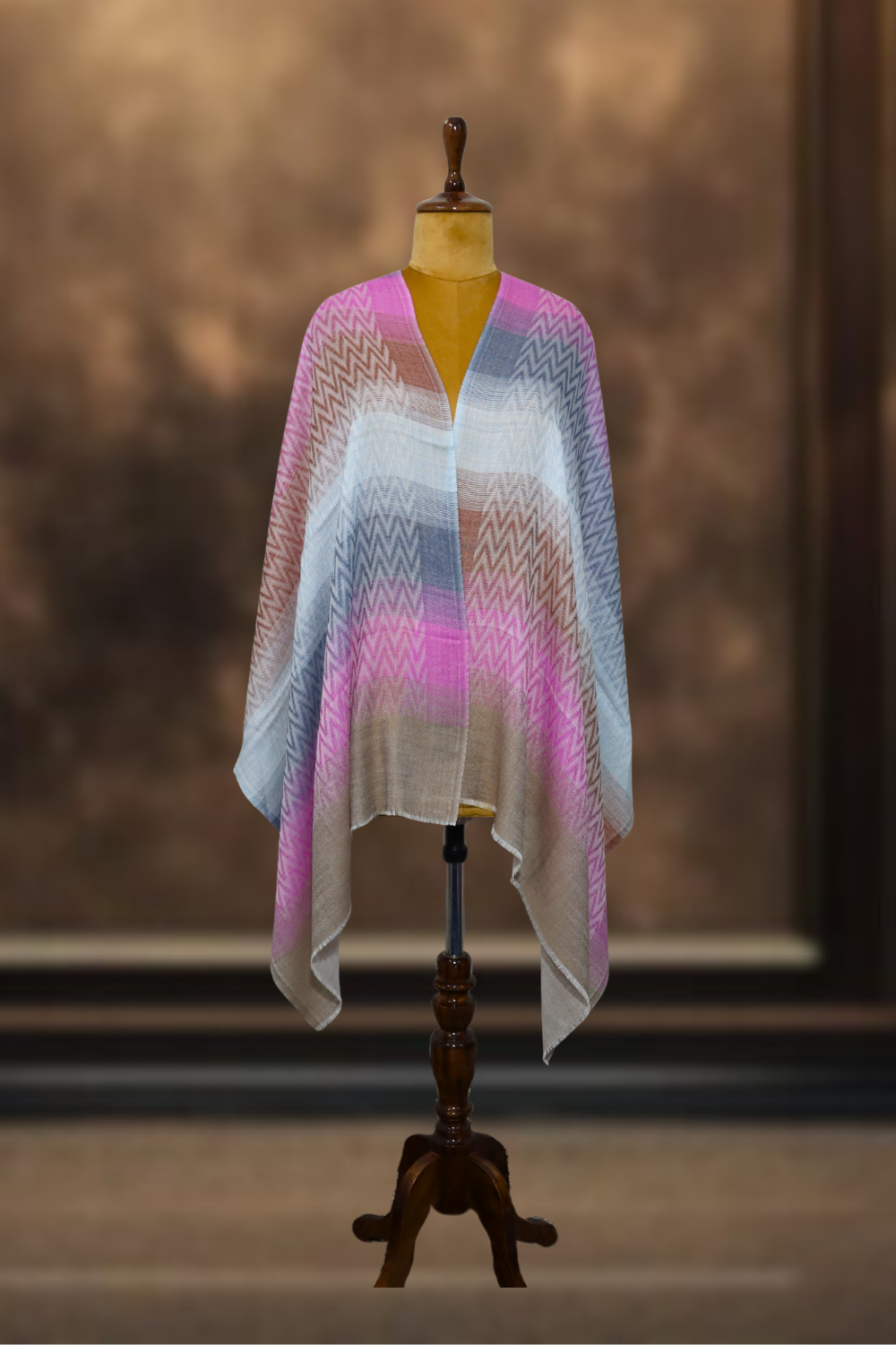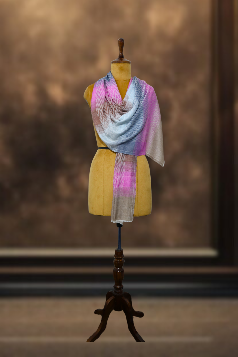 This elegant wrap, woven from a premium cashmere and fine wool blend, displays a sophisticated zigzag Ikkat pattern. Rich fuchsia and deep rose tones transition gracefully into soft greys and warm browns, creating a compelling ombré effect.