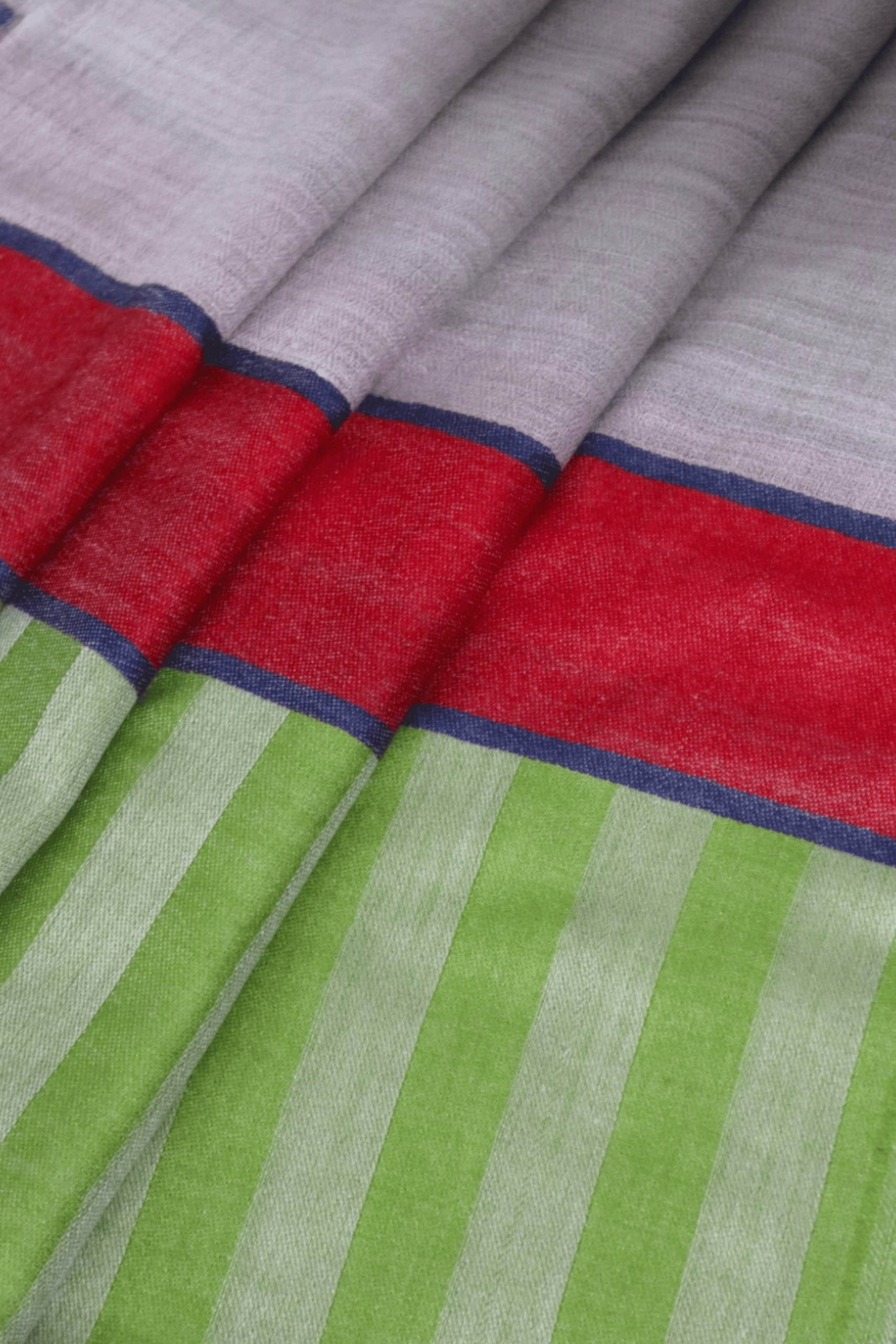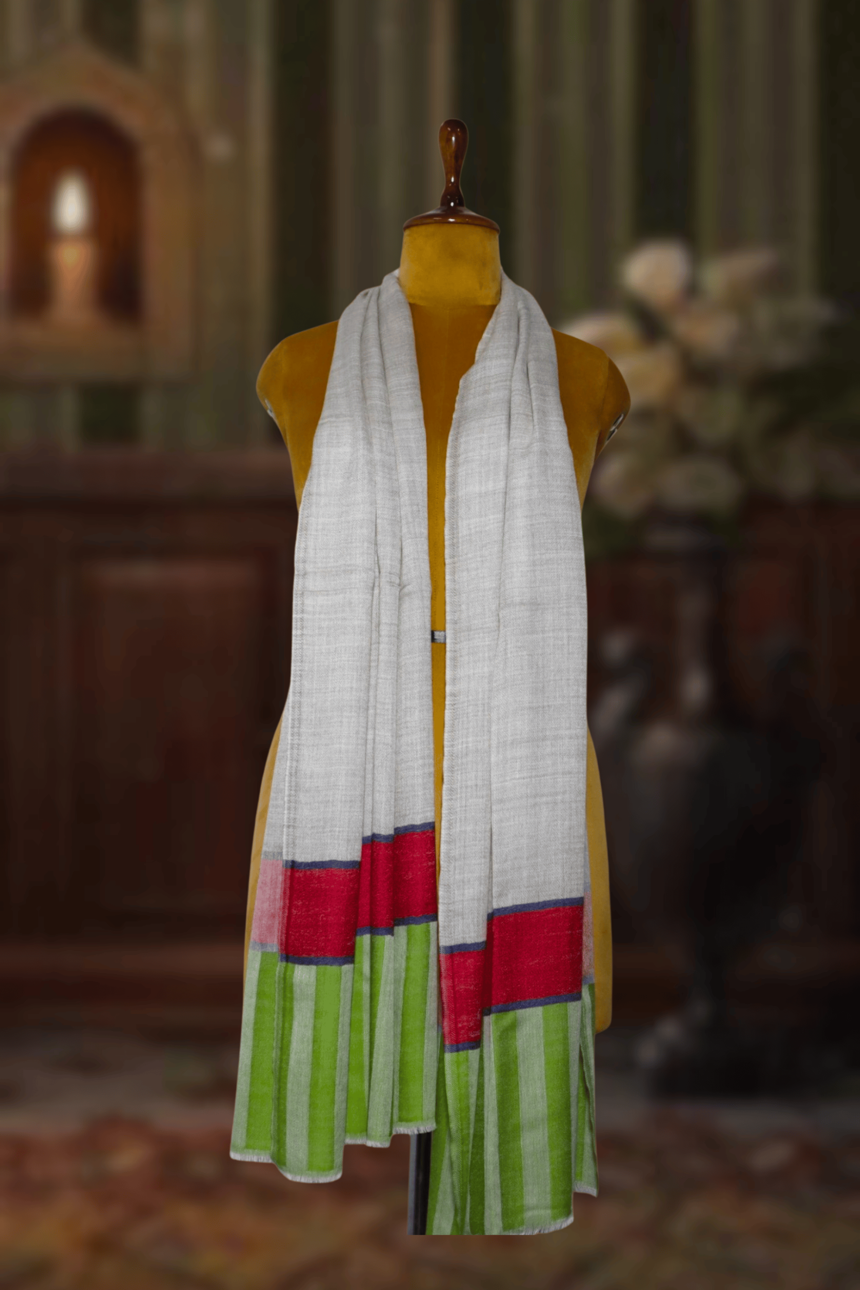 - Description: Embrace vibrant sophistication with this Green Kani Stripe Palla Cashmera Fine Wool Stole. The body of the stole features striking vertical stripes in various shades of green, adding depth and a modern touch. Both ends are beautifully finished with an elaborately woven Kani palla (end panel), with a rich palette of red, green, and blue. Made from Cashmera fine wool, this stole offers comfortable warmth and a luxurious drape, perfect for enhancing any ensemble with its unique blend of patterns and colors.