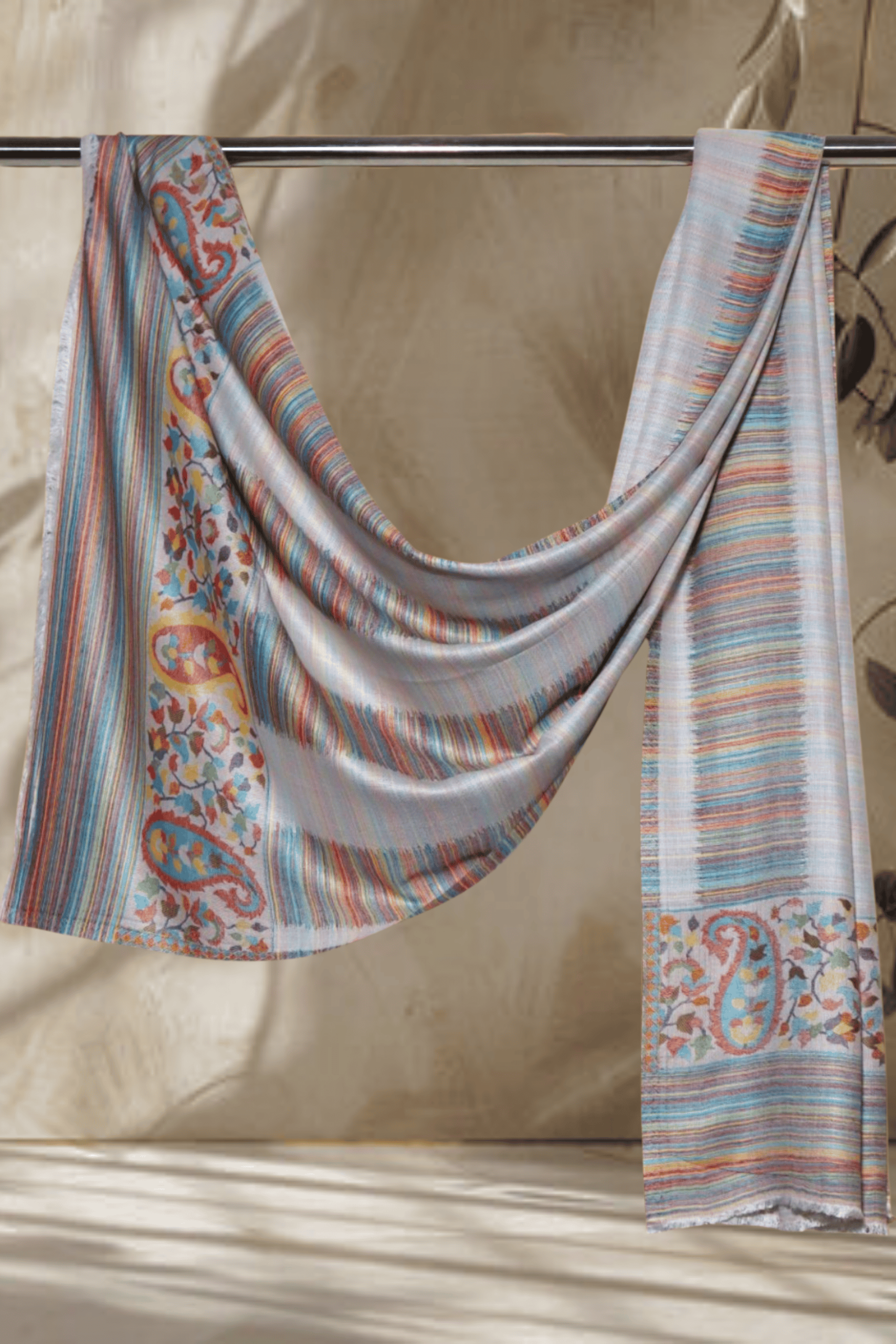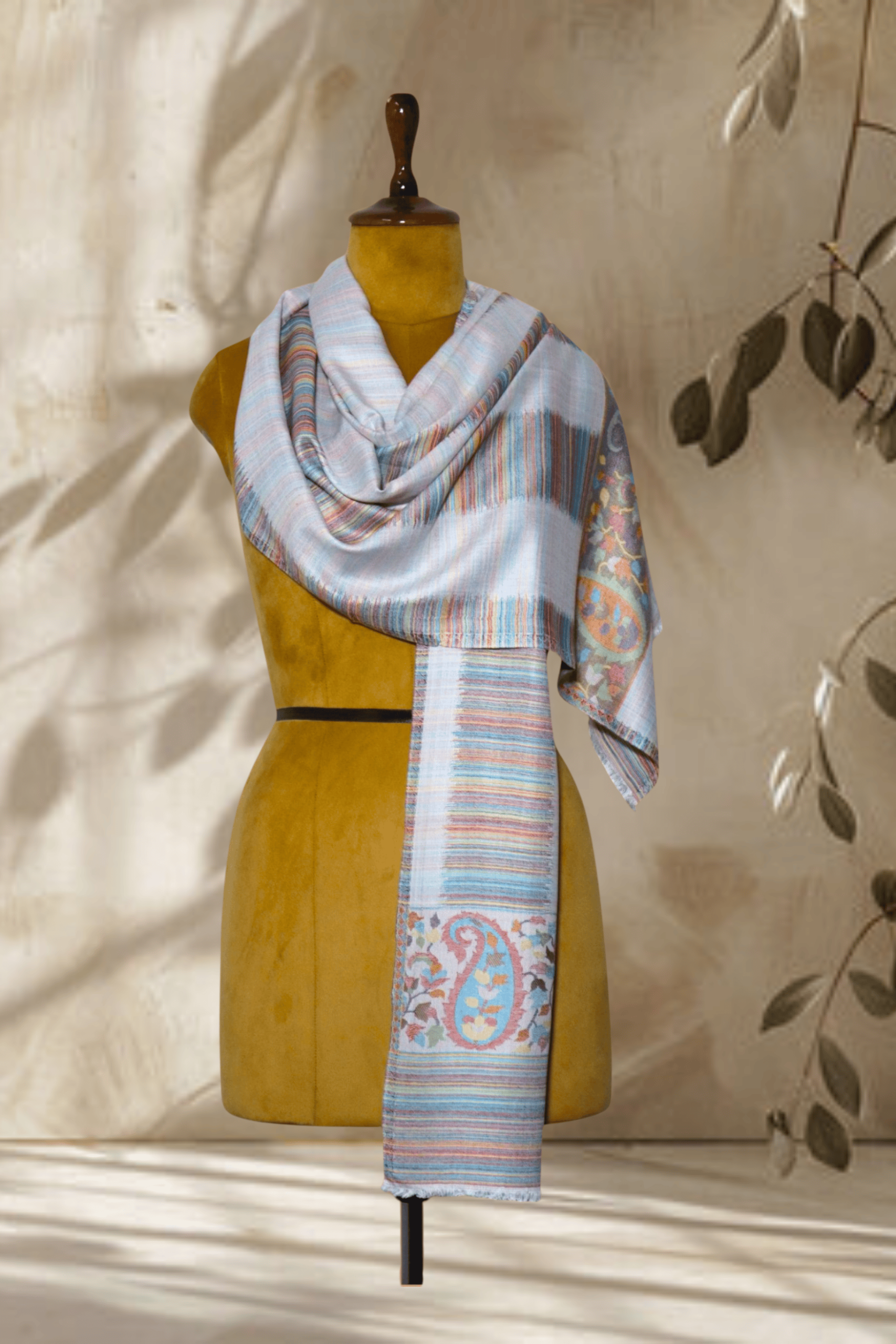 Description: This exquisite Ivory Silk Stripe Jama stole is a harmonious blend of classic and contemporary design. The body of the stole features elegant horizontal stripes in various subtle pastel hues, creating a delicate interplay of colours against the ivory base. Both ends are adorned with beautifully woven traditional paisley motifs in vibrant, multi-coloured tones, adding a touch of Kashmiri artistry. Crafted from silk, this stole offers a luxurious feel and a versatile aesthetic that can complement both modern and traditional ensembles.