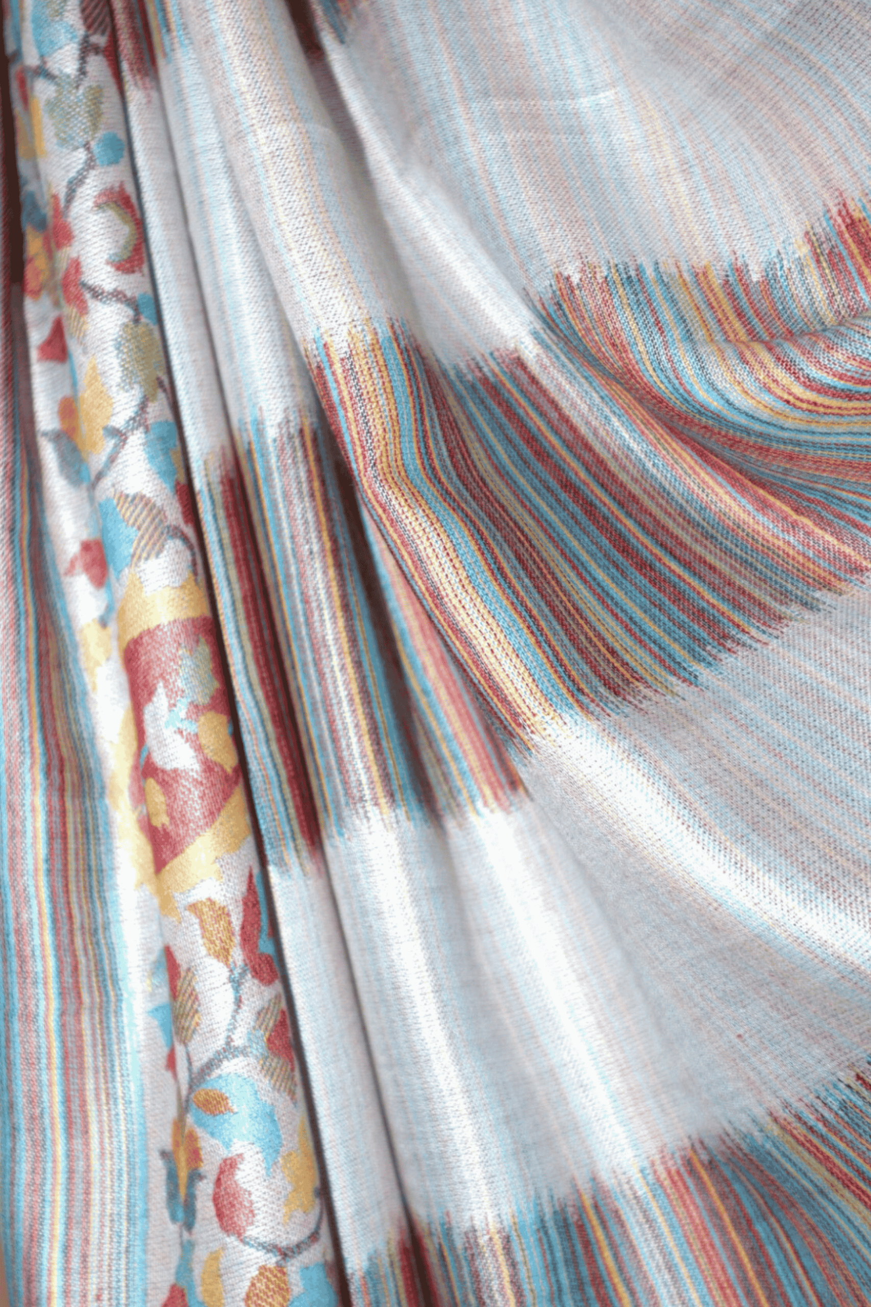 This exquisite Ivory Silk Stripe Jama stole is a harmonious blend of classic and contemporary design. The body of the stole features elegant horizontal stripes in various subtle pastel hues, creating a delicate interplay of colours against the ivory base.
