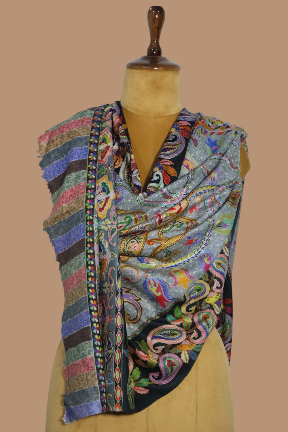 Blending tradition with softness, this stole features folk motifs including animals and stylized flora in pastel hues. Inspired by mural-style Kalamkari of Srikalahasti, the stole is hand-printed and lightly embroidered to create a soothing, elegant accessory. Its Cashmera fine wool texture and gentle color story make it suitable for daywear and artistic wardrobes alike.