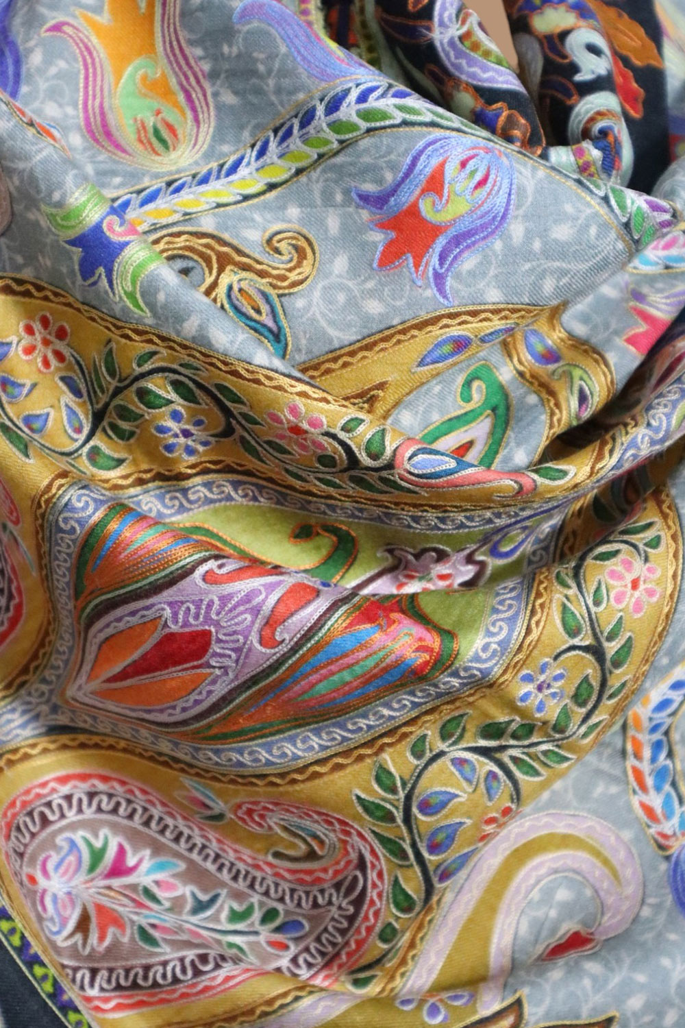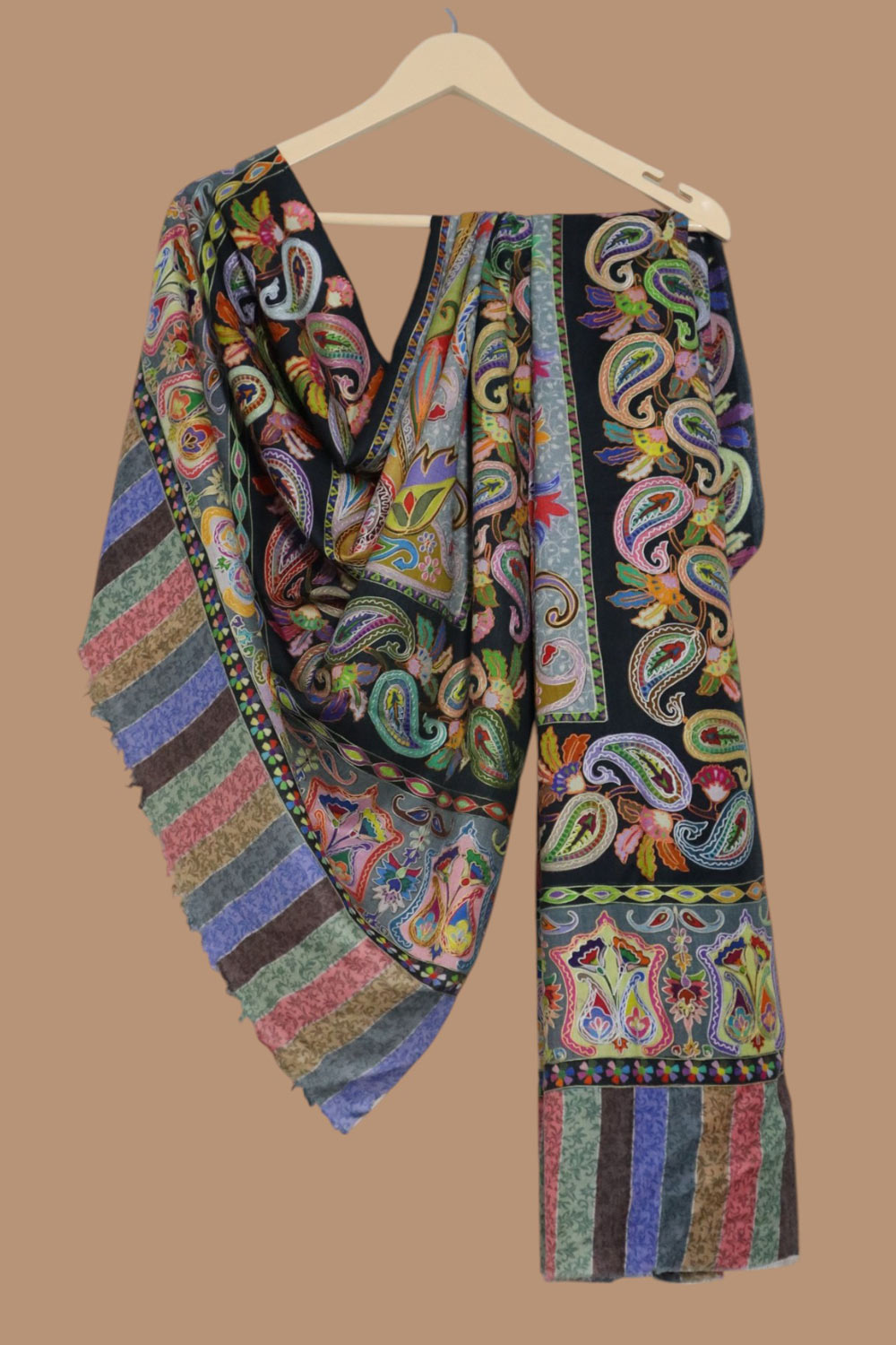 Blending tradition with softness, this stole features folk motifs including animals and stylized flora in pastel hues.