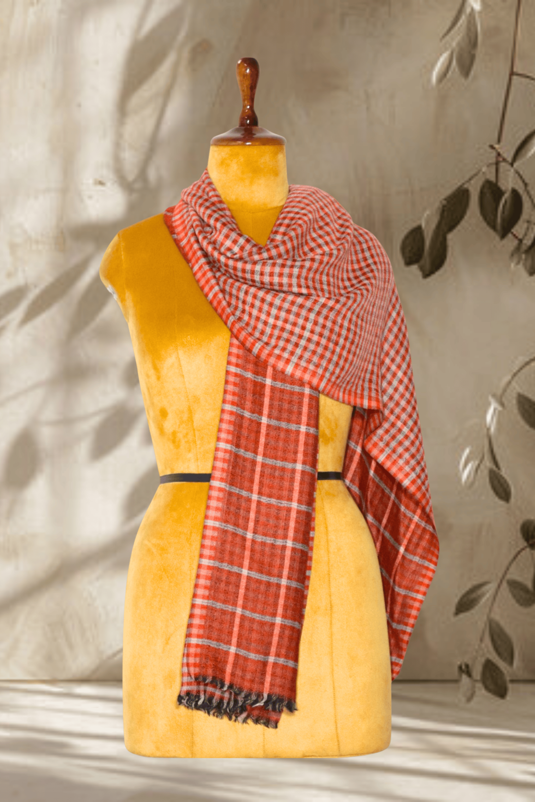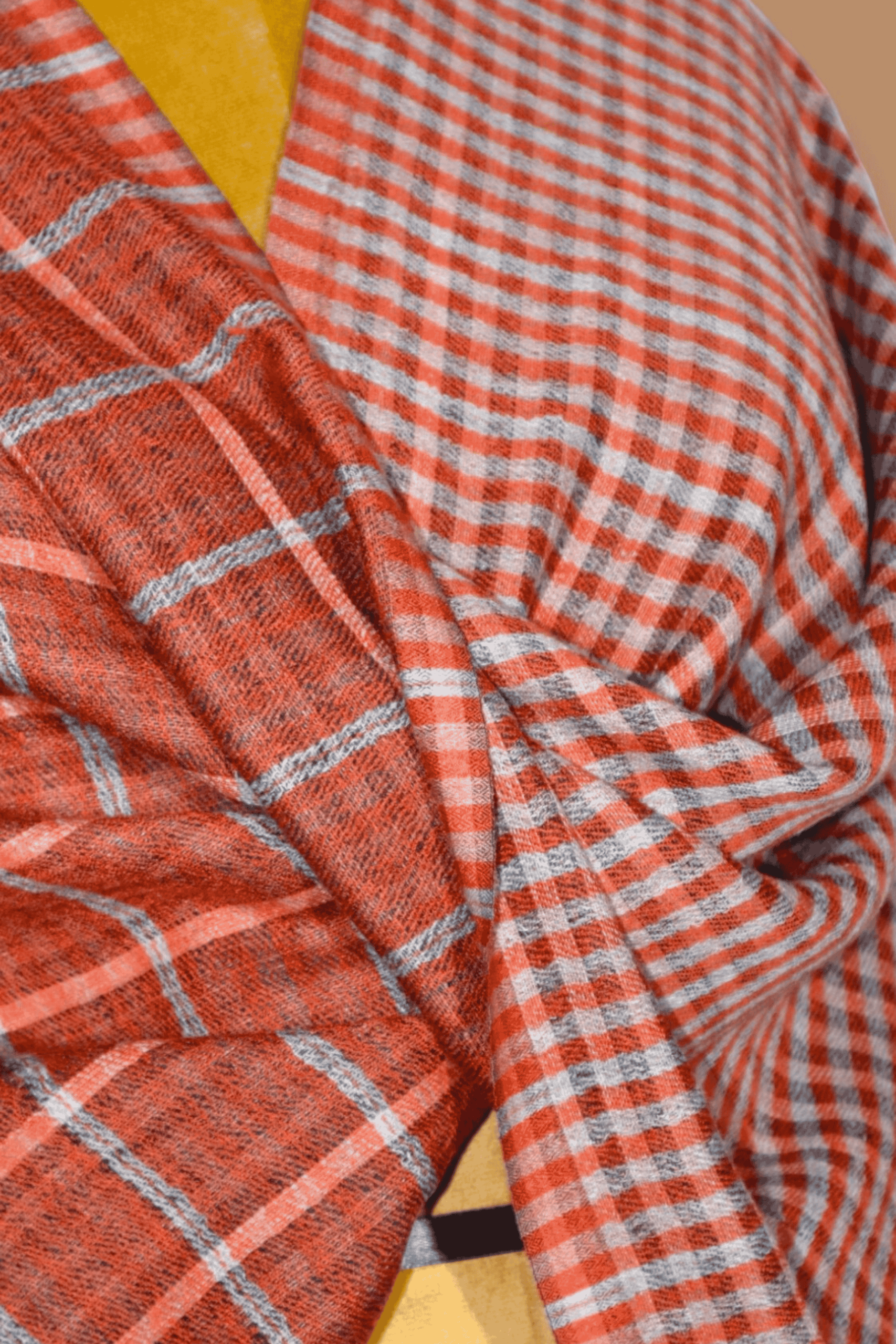 Description: This inviting Reversible Terracotta Checkered Stole brings a touch of earthy elegance to any look. One side features a rustic terracotta and light grey windowpane check, offering a striking yet subtle pattern. The reverse side showcases a finer terracotta and light grey micro-check, providing textural variation. Made from Cashmera fine wool, this Stole is not only visually appealing but also exceptionally warm and soft, perfect for adding a cozy and stylish layer.