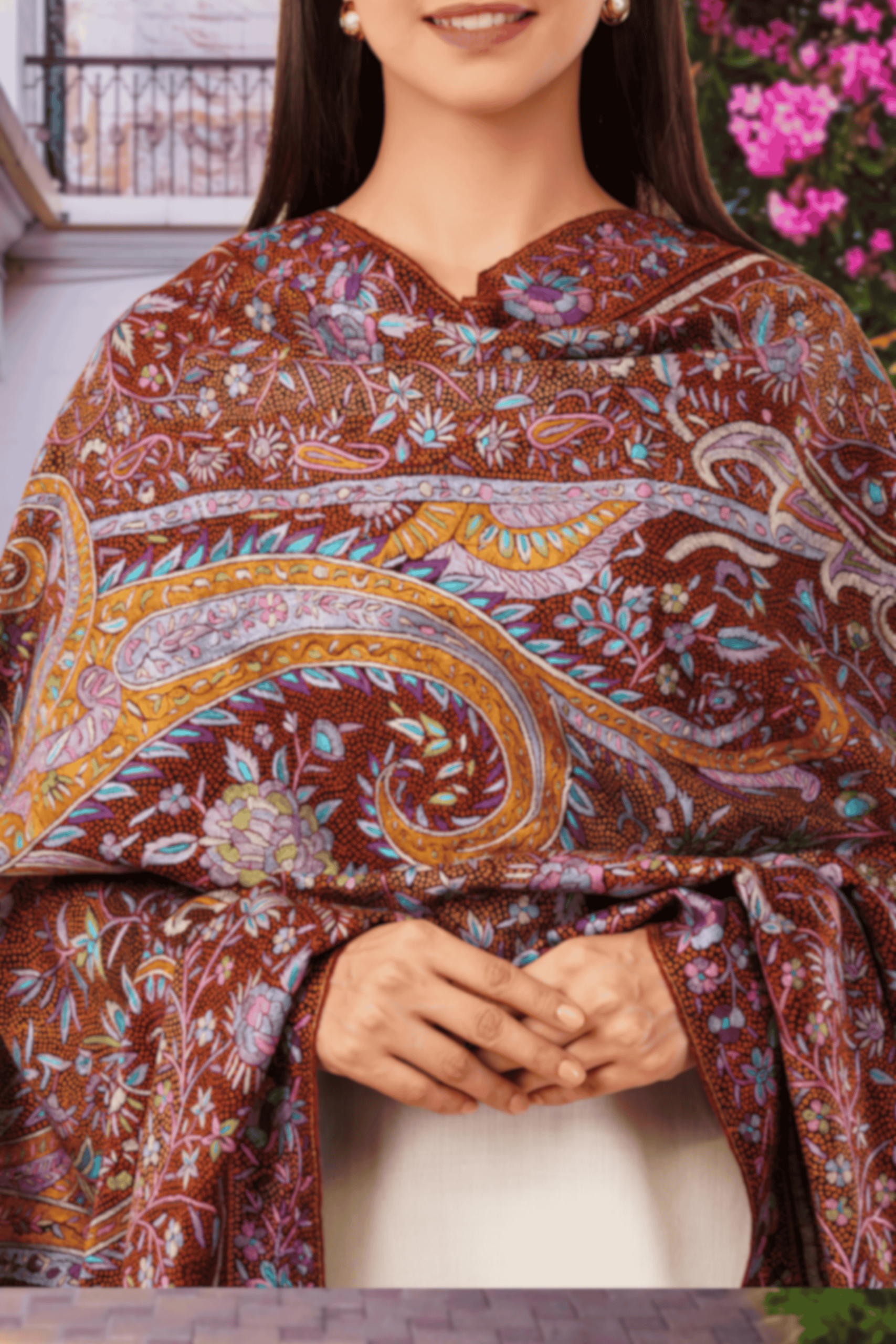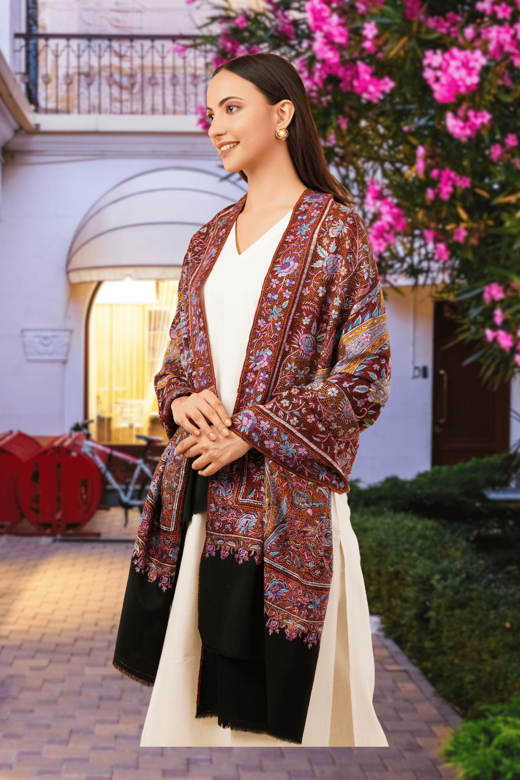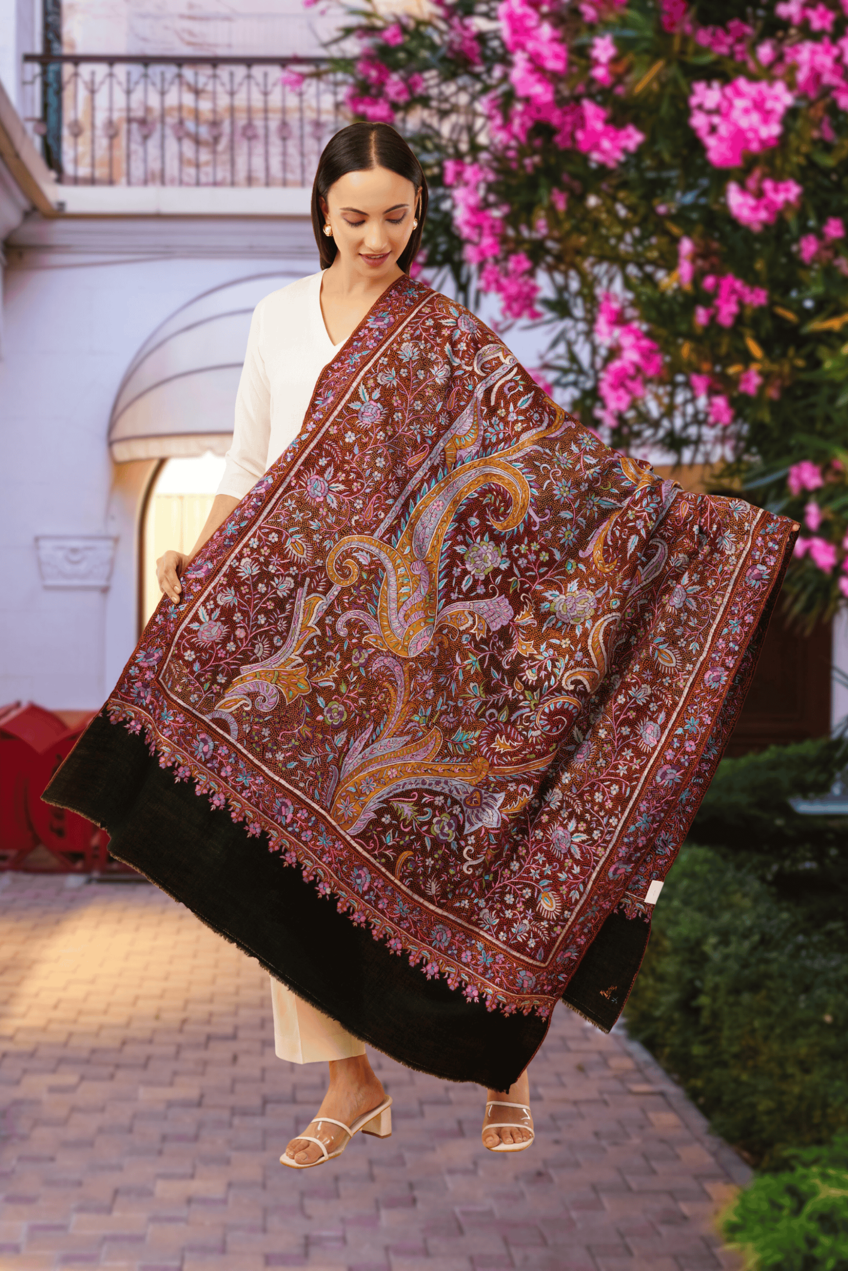 Design: All-over fine needlework in traditional Kashmiri floral patterns
