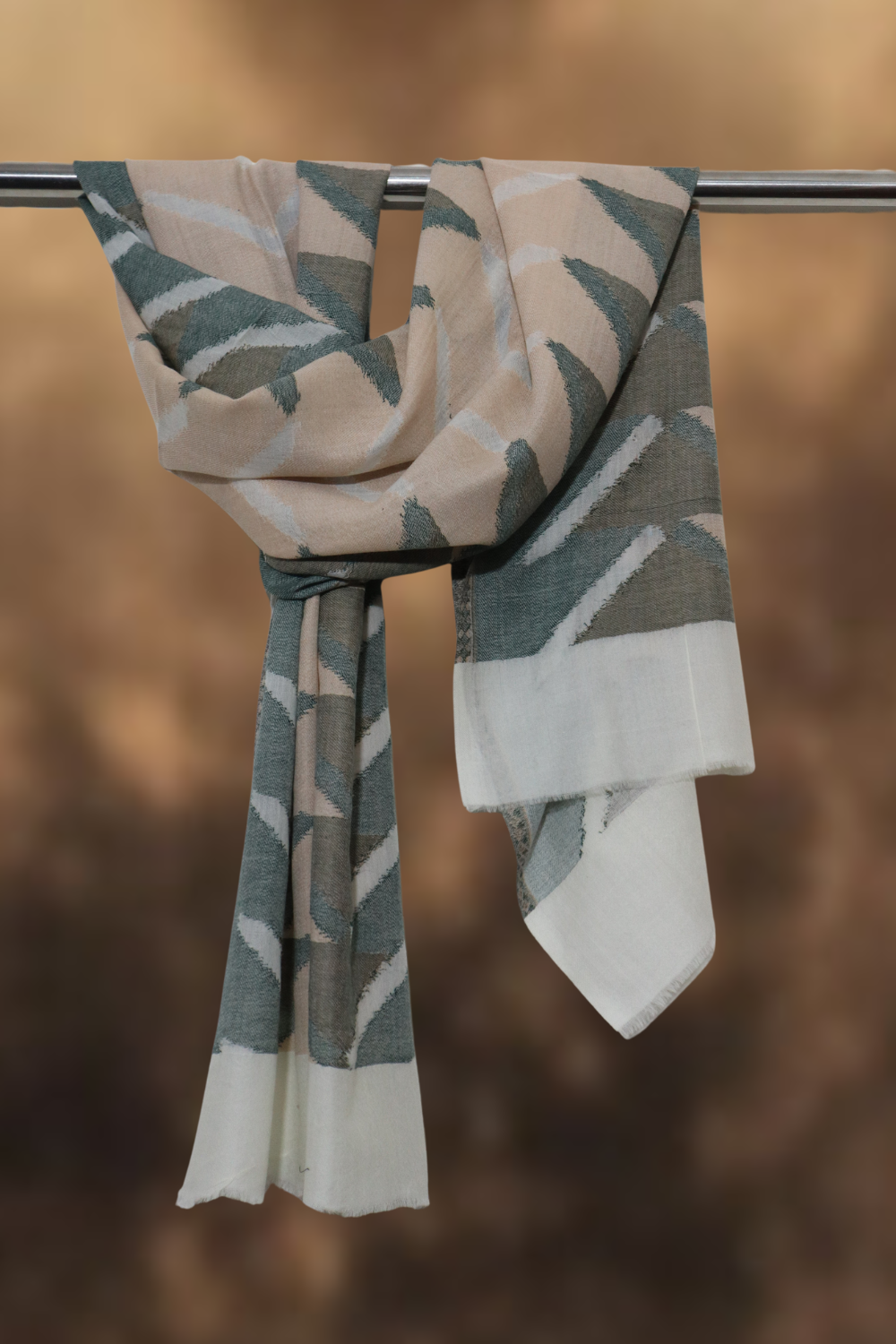 Experience the delicate elegance of our Whispering Pines Ikkat Stole. Woven from a blend of premium cashmere and fine wool, this graceful stole features an intricate Ikkat pattern of abstract, elongated triangles in serene shades of muted sage green, soft peach, and crisp white. The calming color palette and organic design evoke a sense of tranquil natural beauty. Lightweight and exquisitely soft, it’s a versatile piece for effortless style and warmth.